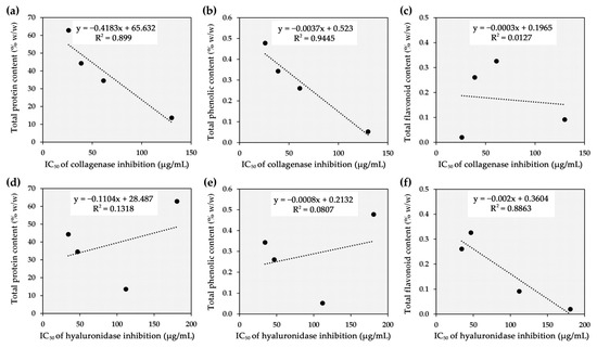 Correlation between half-maximal inhibitory concentration (IC50) against collagenase and total protein content (a), total phenolic content (b), and total flavonoid content (c), along with correlation between IC50 against hyaluronidase and total protein content (d), total phenolic content (e), and total flavonoid content (f).