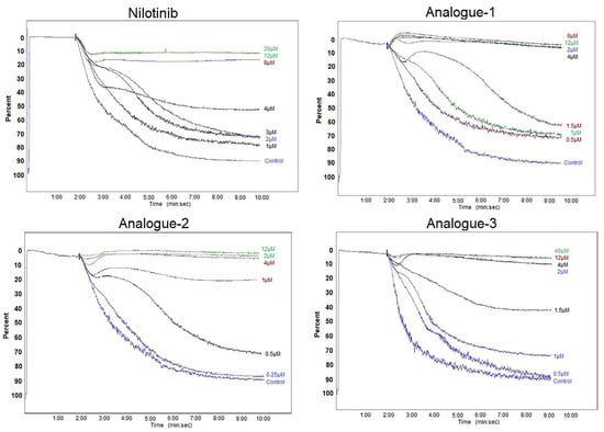 Representative curves of the inhibitory effect of nilotinib and its analogues on AA-induced platelet aggregation. The x axis represents the aggregation time, and the y axis represents the percentage of platelet aggregation. Samples of PRP were incubated with various concentrations of nilotinib, its analogues, or DMSO (as a control) at 37 °C for 5 min. Light transmittance aggregometry (LTA) was performed at 37 °C and under stirring at 1200 rpm, using 300 μM AA as an agonist.