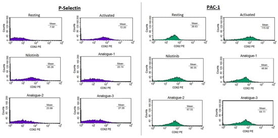 Representative histograms of the effect of nilotinib and its analogues on P-selectin and PAC-1 membrane expression. The x axis represents the P-selectin or PAC-1 antibodies, respectively, and the y axis represents the platelet count. Samples of PRP were incubated in eppendorf tubes with the IC50 value concentrations of nilotinib, its analogues, or DMSO (as a control) for 5 min at 37 °C and then activated with 890 μM AA for 10 min at 37 °C. Moreover, 5 μL of the samples were then incubated with the antibodies (CD62-PE, PAC-1-FITC) for 20 min in the dark at room temperature. The P-selectin and PAC-1 membrane expressions were evaluated by flow cytometry (data from 10,000 events).