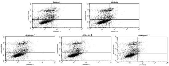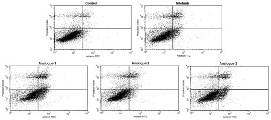 To continue, we performed an apoptosis assay by flow cytometry to assess the potency of the apoptotic effect that nilotinib and its analogues might have on cancer cells. HepG2 cells were treated as described above, collected with Trypsin/EDTA, and after centrifugation at 2500 rpm (938× g) for 7 min, resuspended in 500 μL Annexin-V binding buffer. The analysis was performed after staining the cell suspensions with PI and Annexin-V for 5 min in the dark at room temperature.