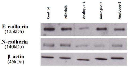 Representative bands of the effect of nilotinib and its analogues on the expression of E-cadherin and N-cadherin by HepG2 cells. Moreover, 20 μg of total protein extracts from each lysate were separated by 8% SDS-PAGE and transferred onto nitrocellulose membranes. The membranes were incubated with the specific primary monoclonal antibodies (E-cadherin, N-cadherin, and β-actin) for 4 h at 4 °C and with a secondary antibody for 1.30 h at 4 °C, under constant agitation. The bands were revealed by enhanced chemiluminescence.