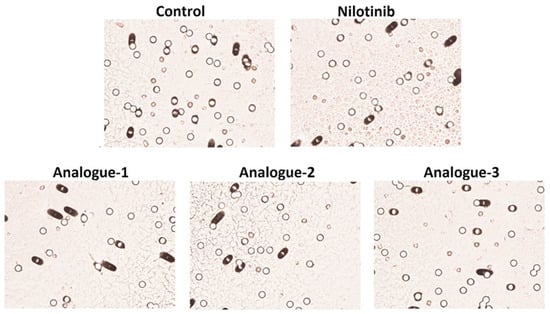 We investigated the effect of these analogues on HepG2 cell migration using the Boyden chamber assay, and all three analogues exhibited statistically significant inhibition compared with control (Figure 8). After the 48-hour incubation, analogues-1 and -3 displayed similar potency on inhibition of cancer cell migration, 25.98% and 25.42%, respectively, in contrast to nilotinib, which presented a mild inhibitory effect (Table 7). These results indicate that the analogues-1 and -3 prevented an amount of cancer cells from invading and migrating to the other side of the Boyden chamber’s membrane.
