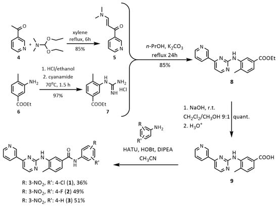 As mentioned above, the intermediates 5 and 7–9 and the final compound 1 have been described by us previously [64]. The experimental procedure for the final step of the target compounds 2 and 3, analogues of nilotinib, and specific details are given below.