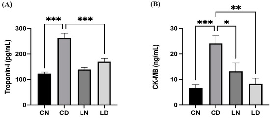 ELISA kits were used on serum samples to determine the serum levels of cardiac biomarkers, which included troponin I and CK-MB, in line with the manufacturer’s instructions. For the troponin I and CK-MB assays, 50 μL of each standard or sample was incubated in the wells of ELISA plates at 37 °C for 1 h. Subsequently, the wells were washed to eliminate all unbound substances. Following the addition of 50 μL of the selected primary antibody to all wells, incubation of the plates was performed at 37 °C for 1 h. Subsequently, 50 μL of a designed secondary antibody was introduced to all wells, followed by incubation of the plates at 37 °C for 1 h. After this had been completed, this was followed by the addition of 100 μL of the substrate to all wells and then a further 30 min of incubation at 37 °C in a dark environment. The final part of process involved the addition of 100 μL of the stop solution to every well, and then a microplate reader (BioTek Instruments, Winooski, VT, USA) was used to measure the absorbance at 450 nm. The calculation of the sample concentrations was performed with a standard curve created according to the guidelines provided with the assay kit.