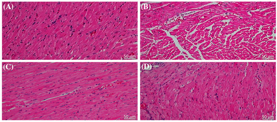 The results of the evaluation of serum cardiac biomarkers, which are indicative of cardiac injury caused by STZ, were corroborated through histopathological examination of sections of heart tissue stained with hematoxylin and eosin (H&E). The cardiac muscle structure in normal, healthy rats was distinctly affected by liraglutide treatment (Figure 2A,B). Notably, liraglutide treatment in diabetic rats resulted in reduced myocardial degeneration compared with that in the diabetic control (Figure 2C,D).
