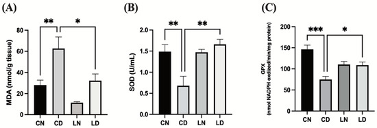 Liraglutide treatment effects on cardiac oxidative stress markers in rats with diabetes. (A) Malondialdehyde (MDA) levels. (B) Superoxide dismutase (SOD) activity. (C) Glutathione peroxidase (GPx) activity. Data are exhibited in the form of means ± SEM (n = 6 samples in each group). One-way ANOVA was used for inter-group comparisons, then the Tukey–Kramer post hoc test. CN, normal control group; CD diabetic control group; LN, nondiabetic rats receiving liraglutide treatment; LD, diabetic rats receiving liraglutide treatment. Differences reaching a level of significance are indicated as ** p < 0.01 and *** p < 0.001 compared with the normal control group (CN), and * p < 0.05; ** p < 0.01 compared with the control group containing diabetic rats (CD).