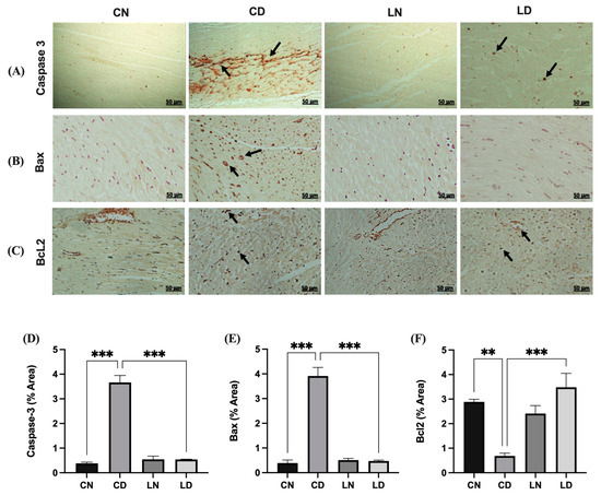 Liraglutide treatment’s effects on caspase 3, BAX, and Bcl2 expression in the heart tissue of rats with diabetes. Photomicrographs showing caspase 3 (A) and BAX (B) immunostaining of the heart sections: (CN) shows normal myocardium cytoplasm and nuclei, (CD) shows strong immunoreactivity in myocardium cell nuclei and moderate immunoreactivity in the cytoplasm (black arrow), (LN) exhibits lack of immunopositive cytoplasm and nuclei, and (LD) shows reduced and few immunopositive nuclei. Bcl2 (C): (CN) shows normal myocardium cytoplasm, (CD) shows strong immunoreactivity in myocardium cell nuclei and moderate immunoreactivity in the cytoplasm, (LN) exhibiting the absence of immunopositive cytoplasm, and (LD) shows a significant reduction in the expression and few immunopositive nuclei. Scale bar = 50 μm; magnification, ×20. Semi-quantification results for caspase 3 (D), BAX (E), and Bcl2 (F) immunoreactivity (using ImageJ software, version 1.8.0_172). Data are expressed as mean ± SEM (n = 3 different analyses per group). Statistical analyses were performed using one-way ANOVA; ** p < 0.01, *** p < 0.001 compared to CD. Abbreviations: CN: normal control rats; CD: diabetic control rats; LN: liraglutide-treated normal rats; LD: liraglutide-treated diabetic rats.