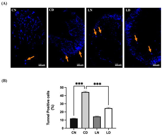Liraglutide treatment’s effect on myocardial apoptosis in rats with type 2 diabetes induced via STZ/high-fat diet (HFD). (A) Photomicrographs showing TUNEL staining of the heart tissue sections from normal control rats (CN), diabetic control rats (CD), liraglutide-treated normal rats (LN), and liraglutide-treated diabetic rats (LD). TUNEL-positive cells are indicated by orange arrows and are displayed in light blue (original magnification, ×100). (B) Quantification of TUNEL-positive cells in the heart tissue sections from diabetic rats, expressed as a percentage of total nuclei detected using DAPI staining. Data are presented as means ± SEM (n = 4 randomly selected fields per slide, with each slide representing one tissue sample, totaling six samples per group). *** p < 0.001 in comparison to normal and diabetic controls, respectively.