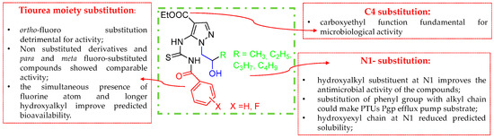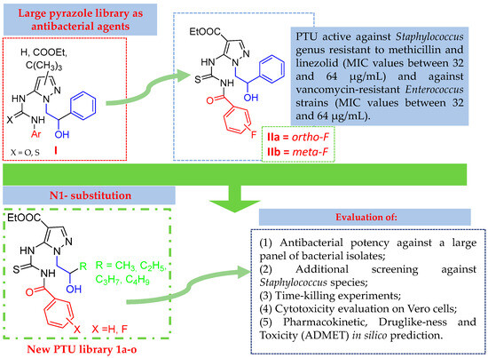 The pyrazole scaffold represents a privileged substructure in medicinal chemistry research and a number of pyrazole derivatives have been evaluated as effective compounds in different therapeutic areas [10,11,12,13,14,15,16], including infectious diseases [17,18] and also against MRSA [19]. In previous studies, pyrazole derivatives I (Figure 1) showed significative antibacterial activity against Gram-positive antibiotic-resistant strains [20]. The prepared molecules were characterized by a N1-hydroxy-2-phenylethyl chain, a carboxyethyl or tert-butyl substituents on C3 or C4 and a (thio)ureido moiety at position 5 of the pyrazole ring. The structure activity relationships (SARs) evidenced that a carboxyethyl group on C4 and a substituted thioureido function on C5 are key structural determinants for the antimicrobial activity of this series (derivatives II, Figure 1). Pyrazolyl thioureas (PTUs) II resulted inactive against all tested Gram-negative species but showed a good antibacterial potency against strains of the Staphylococcus genus resistant to methicillin and linezolid (MIC values between 32 and 64 µg/mL) and also against vancomycin-resistant Enterococcus strains (MIC values between 32 and 64 µg/mL).