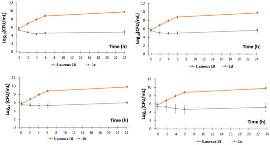 Time-killing curves performed with compounds 1c, 1d, 1n, 1h at a concentration of 4× MIC on S. aureus 18 (MRSA). Error bars represent standard deviations (n = 3) of the mean values. Similar results were obtained for S. aureus strains 17, 187 and 195.