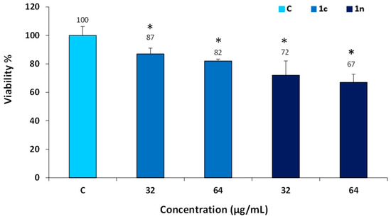 Cytotoxicity of compounds 1c (in light blue) and 1n (in blue) performed at concentrations 32 and 64 μg/mL on Vero cells. Data, expressed as percentage of viability versus untreated cultures and extrapolated by MTT assay, are the means ± SD of three separate experiments performed in triplicate. * = p < 0.01 versus untreated cultures (ANOVA and Dunnett test). At a concentration of 32 µg/mL, tested compounds showed the highest viability rates. According to ECVAM guidelines, compounds 1c and 1n can therefore be considered low toxic (at 32 µg/mL) and moderately toxic (at 64 µg/mL).