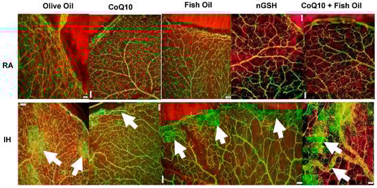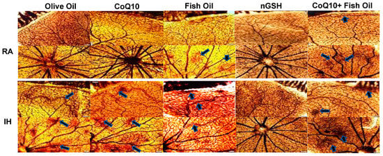 - Beharry, K.D.; Cai, C.L.; Siddiqui, F.; Chowdhury, S.; D’agrosa, C.; Valencia, G.B.; Aranda, J.V. Comparative effects of coenzyme Q10 or n-3 polyunsaturated fatty acid supplementation on retinal angiogenesis in a rat model of oxygen-induced retinopathy. Antioxidants 2018, 7, 160. [Google Scholar] [CrossRef]