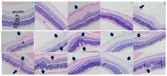 | ONL thickness (µm) | 81.6 ± 1.1 | 71.4 ± 1.4 * | 82.8 ± 2.4 | 73.7 ± 2.9 | 87.3 ± 4.8 |