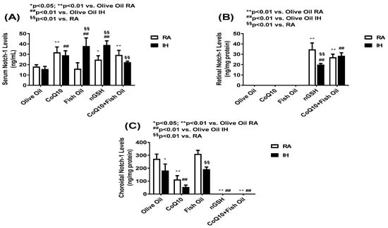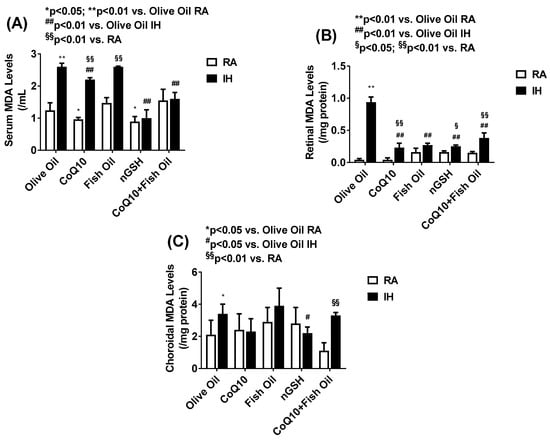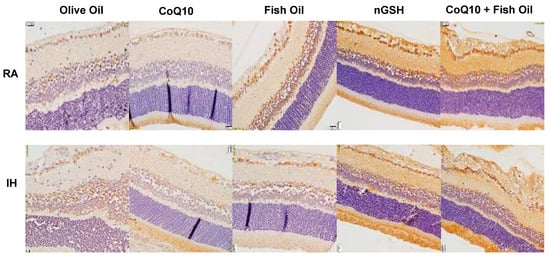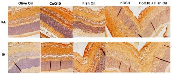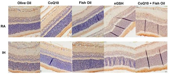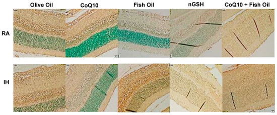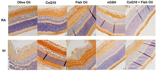 - Siddiqui, F.; Cai, C.; Aranda, J.V.; Beharry, K.D. Coenzyme Q10 and Fish Oil Supplementation for Reducing Retinal Oxidative Stress in a Rat Model. Vision 2023, 7, 20. [Google Scholar] [CrossRef] [PubMed]