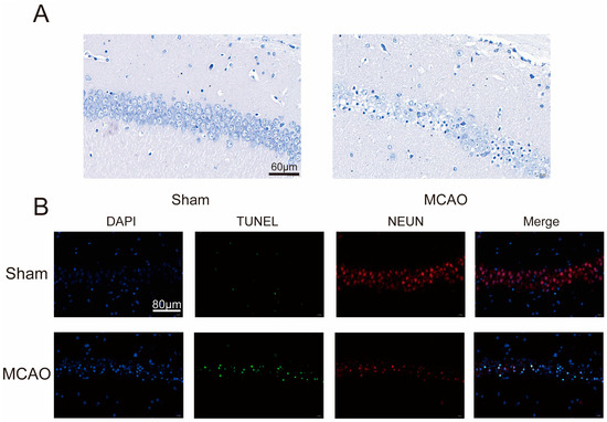 MCAO group mice exhibited clear neural damage. (A) Nissl staining of brain sections, under a biological microscope. Nissl bodies appear purple-blue, nuclei are blue, with a scale bar of 60 μm. (B) Representative images of brain sections co-stained with DAPI, TUNEL, and NEUN. Scale: 80 μm. Apoptotic cells on tissue slices exhibit green fluorescence and neuron appears as red fluorescence under a fluorescent microscope.