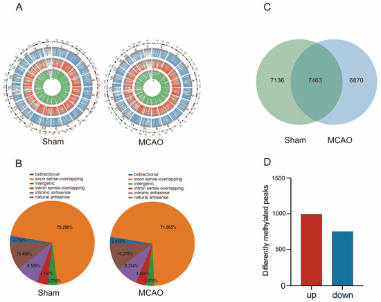 We conducted a comprehensive investigation into the distribution of lncRNAs m5C methylation sites across the genome in mice subjected to MCAO and in normal mice (Figure 3A). A total of 14,599 m5C peaks of lncRNAs in MCAO mice and 14,333 m5C peaks of lncRNAs in normal mice were identified. Our findings revealed that m5C methylation sites of lncRNAs were dispersed across all chromosomes. Furthermore, we observed that, in comparison to autosomal chromosomes, the distribution of lncRNAs m5C on sex chromosomes was reduced in both the MCAO and the Sham groups. Furthermore, a descriptive statistic was also made for the source of all m5C-methylated lncRNAs and observed that m5C methylation lncRNAs were mainly localized to the exon sense-overlapping regions, followed by natural antisense and intronic antisense (Figure 3B).