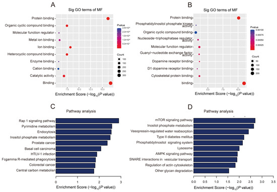 In order to reveal the potential roles of differentially methylated lncRNAs, GO enrichment analysis was carried out. For the biological process (BP), the genes with upper methylation m5C locus were enriched in the cellular process and the primary metabolic process (Figure S1A), while the genes with hypomethylation m5C locus were enriched in cellular component organization or biogenesis and establishment of localization (Figure S1B). For cellular composition (CC), genes with up-regulated methylated m5C loci were enriched in an intracellular anatomical structure and a membrane-bounded organelle (Figure S1C). Genes with hypomethylation m5C loci were enriched in intracellular organelle and cytoplasm (Figure S1D). For molecular function (MF), the genes with hypermethylation m5C loci were mainly enriched in ion binding, metal ion binding and heterocyclic compound binding, and down-regulated methylation sites were related to dopamine receptor binding, phosphatidylinositol phosphate kinase activity, and nucleoside-triphosphatase regulator activity (Figure 4A,B). Dopamine receptors play a crucial role in the occurrence, development, and prognosis of stroke. Levodopa/benserazide treatment significantly improved the recovery of sensorimotor function after transient middle cerebral artery occlusion without affecting the infarct volume [45]. Metal ions play important roles in processes such as neuronal cell damage, oxidative stress, and inflammation. Iron has emerged as a key factor in post-reperfusion injury, and its metabolism in the brain is tightly regulated. Imbalances in iron metabolism, including overload and deficiency, have been shown to affect the outcome of ischemic stroke [46]. Copper acts as a catalytic cofactor in various physiological processes such as energy metabolism, mitochondrial respiration, and antioxidation. Low levels of copper ions can exacerbate tissue ischemia/reperfusion injury, while optimal levels of copper ions can improve tissue damage [47]. The oxidized purine-nucleoside triphosphatase (hMTH1) is a repair enzyme for oxidative DNA damage in brain tumors and neurons of Alzheimer’s disease. In the acute or subacute phase of cerebral infarction, astrocytes show a strong immunoreactivity to hMTH1, and oxidative stress rapidly induces the accumulation of hMTH1 [48].