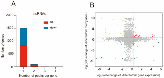 To investigate the correlation between gene expression and m5C methylation, we performed a joint analysis with differently methylated and expressed lncRNAs. We firstly assessed the number of methylated m5C peaks with their corresponding lncRNAs. By analyzing the distribution of m5C modification peaks in each gene, we observed that the majority of genes (1504/1744) harbor one m5C methylation peak (Figure 6A). The methylated peaks that are up-regulated or down-regulated show a similar distribution across the genes (lncRNAs with one up-regulated m5C modification peak vs. lncRNAs with one down-regulated m5C modification peak: 83.77% vs. 89.36%; lncRNAs with two up-regulated m5C modification peaks vs. lncRNAs with two down-regulated m5C modification peaks: 6.4% vs. 4.5%).