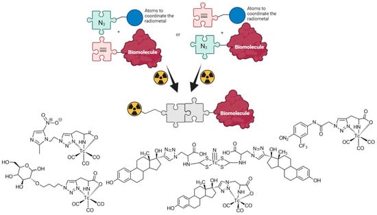 The term “click chemistry” describes a group of reactions characterized by a high yield and high selectivity, thus allowing the joining of 2 molecular units with easily removable byproducts and using mild conditions. This type of reaction was first proposed by Dr. Barry Sharples’s group [1] and since then has been used in a variety of fields, including drug discovery, bioconjugation, materials science, and nanoscience [2,3,4]. The development of radiopharmaceuticals is not an exception [5,6]. The first reported application of “click chemistry” in this field was the assembly of a triazole-based multidentate chelating system attached to biomolecules through the Huisgen 1,3-dipolar cycloaddition of alkynes and azides [7]. In fact, 1,4-functionalized 1,2,3-triazoles are potentially versatile ligands offering several donor sites for metal coordination and have been extensively applied to the preparation of potential 99mTc radiopharmaceuticals [8,9,10]. Our group has utilized this method for the synthesis of glucose, nitroimidazole, flutamide, and estradiol derivatives for technetium labeling (Figure 1) [11,12,13,14,15,16].