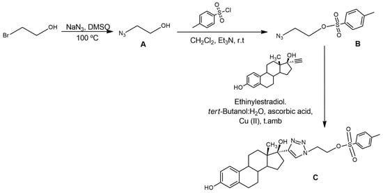 The synthesis of 2-(4-((13S,17S)-3,17-dihydroxy-13-methyl-7,8,9,11,12,13,14,15,16,17-decahydro-6H-cyclopenta[a]phenanthren-17-yl)-1H-1,2,3-triazol-1-yl)ethyl 4-methylbenzenesulfonate (C) was performed by a two steps] procedure using 2-bromoethanol as the starting reagent as shown in Figure 4. The first reaction step involved the substitution of the bromine atom for an azide group to obtain A. The second step was the incorporation of the tosyl group as a good leaving group to obtain B, and finally, a Huisgen reaction between the azide of B and the terminal triple bond of ethinylestradiol to obtain C (Figure 4).