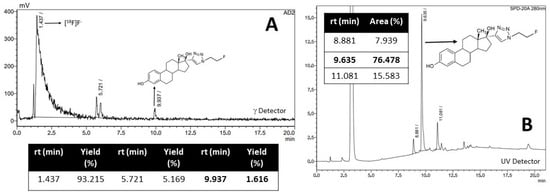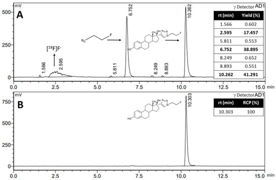 (A) Chromatographic profile obtained for entry 9 of Table 2; (B) Chromatographic profile obtained after the purification of [18F]F-FEET.
