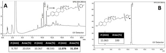 The substitution of the bromine atom for the azide group was achieved using sodium azide in anhydrous dimethyl sulfoxide for 24 h through the technique of Berta et al. [36], obtaining A with a yield higher than 90%. The incorporation of the tosyl group was carried out according to the technique of Hay et al. [37]. After five days of reaction, although the starting reagent methylsulfonyl chloride was not completely consumed, the reaction was finalized due to the presence of a new species with a lower Rf, verified by chromatographic analysis. This species was purified by column chromatography, using alumina as the stationary phase, obtaining B with a yield of 17%. The last step was the “click reaction,” a 3 + 2 cycloaddition catalyzed by Cu(I). The terminal alkyne of ethinylestradiol reacted with the azide of B to form a triazole ring. This reaction occurred in an aqueous medium and was catalyzed by Cu(I). Cu (I) was generated in situ by the action of ascorbic acid in the presence of Cu(II) [7,13,14]. After 6 days of reaction, extractions with ethyl acetate were carried out, and C was obtained with a yield higher than 100% due to the presence of residual ethinylestradiol and salts in the crude reaction.