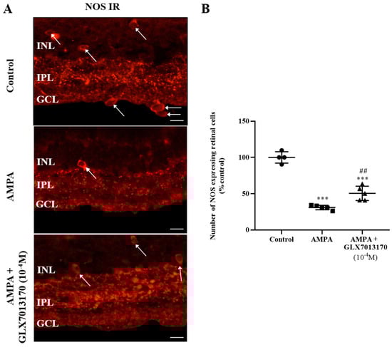 (A). Representative images of nitric oxide synthetase (NOS) immunoreactivity (IR) in control, AMPA, and AMPA + NOX2 inhibitor (GLX7013170) rat retinas. Magnification: ×40. Scale bar: 50 μm. Arrows depict NOS-expressing amacrine cells. NOS-positive amacrine cell somata are localized mainly in the Inner Nuclear Layer (INL), processes in the Inner Plexiform Layer (IPL), while displaced amacrine cells are also observed in the Ganglion Cell Layer (GCL). (B). Quantification study of NOS IR in control, AMPA, and AMPA + NOX2 inhibitor (10−4 M, 5 μL) rat retinas. NOX2 inhibitor, GLX7013170, afforded partial neuroprotection to NOS-positive amacrine cells against AMPA excitotoxicity (*** p < 0.001, compared to control, ## p < 0.01 compared to AMPA). Data are expressed as Mean ± SD and analyzed by one-way ANOVA, followed by Newman–Keuls post hoc analysis.