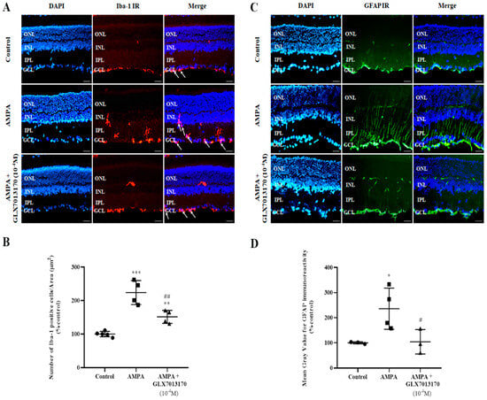 Macroglia: AMPA administration caused a statistically significant increase in the expression of GFAP in the retina, an effect that was reversed by co-administration of AMPA with the NOX2 inhibitor, GLX7013170 (10−4 M, 5 μL) (Figure 2C,D, * p < 0.05 compared to control, # p < 0.05 compared to AMPA).