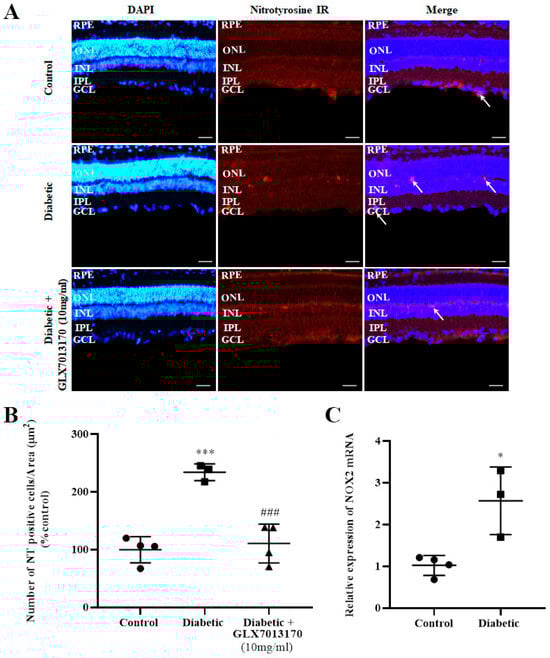 Nitrotyrosine, as a result of the nitration of tyrosine residues of proteins due to oxidative stress, is commonly used as a marker for the evaluation of oxidative damage in a tissue. In the two-week model of DR in the present study, diabetes was correlated with a significantly increased number of NT-positive cells present in the retina. Treatment with the NOX2 inhibitor, GLX7013170 [300 × 10−4 M (10 mg/mL), 20 μL/eye] reversed the aforementioned effect (Figure 3A,B, *** p < 0.001 compared to control, ### p < 0.001 compared to diabetic non-treated).