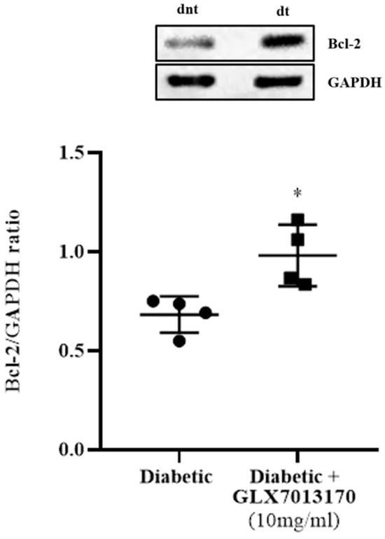 Representative Western blot and quantification study of B-cell lymphoma 2 (Bcl-2) protein expression in control, diabetic non-treated, and diabetic treated [GLX7013170, 300 × 10−4 M (10 mg/mL), 20 μL/eye] rat retinas, in the 2-week model of DR. GLX7013170 was associated with the upregulation of Bcl-2 protein in the diabetic retina, two weeks after STZ administration. Data are expressed as Mean ± SD and analyzed by two-tailed unpaired t-test. (* p < 0.05 compared to diabetic non-treated retinas).