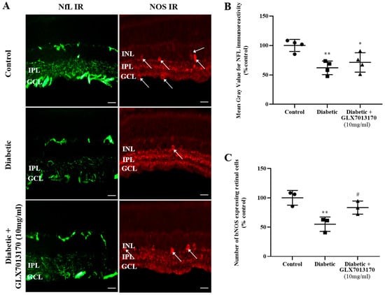 (A). Representative images of Neurofilament (NfL) and nitric oxide synthase (NOS) IRs in control, diabetic non-treated, and diabetic treated [GLX7013170, [300 × 10−4 M (10 mg/mL), 20 μL/eye] retinas in the two-week DR paradigm. Magnification: ×40. Scale bar: 20 μm. Arrows depict NOS-expressing amacrine cells. (B). Quantification study of NfL IR in control, diabetic non-treated, and diabetic treated retinas in the two-week DR paradigm. GLX7013170 had no effect on the diabetes-induced reduction in NfL IR (* p < 0.05, ** p < 0.01 compared to control). (C). Quantification study of bNOS IR in the three groups examined. Diabetes attenuated the number of NOS-positive amacrine cells in a statistically significant manner, an effect that was attenuated by NOX2 inhibitor, GLX7013170 (** p < 0.01 compared to control, # p < 0.05 compared to diabetic non-treated). Data are expressed as Mean ± SD and analyzed by one-way ANOVA, followed by Newman–Keuls post hoc analysis.