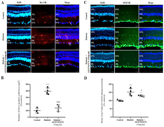 (A). Representative images of Iba-1 IR in control, diabetic non-treated, and diabetic treated [GLX7013170, 300 × 10−4 M (10 mg/mL), 20 μL/eye] retinas, in the two-week DR paradigm. Magnification: ×20. Scale bar: 20 μm. Arrows depict Iba-1-positive cells. DAPI and Merge are also presented in each case. (B). Quantification study of Iba-1 IR in control, diabetic non-treated, and diabetic treated retinas, in the two-week DR paradigm. Iba-1-positive cells were manually counted from Ganglion Cell Layer (GCL) to Inner Nuclear Layer (INL) and the number was normalized to the corresponding area. Diabetes increased the activation of microglia in rat retina, two weeks after streptozotocin administration. GLX7013170 reversed this effect (*** p < 0.001 compared to control, ### p < 0.001 compared to diabetic non-treated). (C). Representative images of GFAP IR in control, diabetic non-treated, and diabetic treated [GLX7013170, 300 × 10−4 M (10 mg/mL), 20 μL/eye] retinas, in the two-week DR paradigm. Magnification: x20. Scale bar: 20 μm. DAPI and Merge are also presented in each case. (D). Quantification study of GFAP IR in control, diabetic non-treated, and diabetic treated retinas, in the two-week DR paradigm. Mean gray value of GFAP IR was measured from Ganglion Cell Layer (GCL) to Outer Nuclear Layer (ONL). Two weeks after streptozotocin administration, the expression of GFAP in rat retina was significantly increased, while GLX7013170 attenuated this effect (* p < 0.05, ** p < 0.01 compared to control, # p < 0.05 compared to diabetic non-treated). Data are expressed as Mean ± SD and analyzed by one-way ANOVA, followed by Newman–Keuls post hoc analysis.