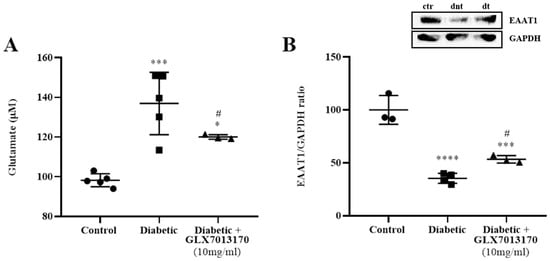 We further performed Western blot analysis, for the determination of the expression of EAAT1 in the two-week model of DR. Diabetes attenuated EAAT1 levels in the diabetic non-treated retinas. This was partially reversed by treatment with GLX7013170 (Figure 7B, *** p < 0.001, **** p < 0.0001 compared to control, # p < 0.05 compared to the diabetic non-treated group).