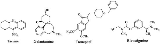 Alzheimer’s disease (AD) is a chronic neurological disorder characterized by memory impairment, cognitive dysfunction, behavioral disturbances and deficits in activities of daily living [1,2,3]. AD has been found to be associated with a cholinergic deficit in the postmortem brain characterized by a significant decrease in the amount of acetylcholine [4,5]. AD has become a major problem, particularly in developed countries, due to increasing old-age populations with a high quality of life. Acetylcholine is a neurotransmitter inhibited, primarily, by acetylcholinesterase (AChE) and, secondarily, by butyrylcholinesterase (BuChE), which are considered to play a role in the pathology of AD [6]. Both enzymes are present in the brain and are detected in neurofibrillary tangles and neurotic plaques [7]. Despite the unknown etiology of AD, elevation of acetylcholine amounts through AChE enzyme inhibition has been accepted as the most effective treatment strategy against AD [8]. Therefore, AChE and BuChE inhibitors have become remarkable alternatives in the treatment of AD. However, the present drugs (e.g., tacrine, galantamine, donepezil and rivastigmine) (Figure 1) with AChE inhibitory activity possess some side effects and are effective only against the mild type of AD, and currently there is no drug with BuChE inhibitory activity available [9,10].