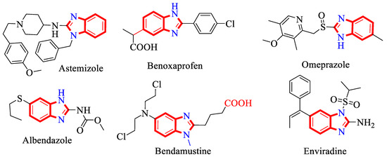 Benzimidazole possesses a diverse range of biological activities, such as anti-hypertensive [11,12], anti-Alzheimer’s [13], anti-microbial, anti-viral [14], anti-diabetic [15,16] and anti-cancer activities [17]. There are some drug molecules, such as benoxaprofen, albendazole, enviradine, bendamastine, omeprazole and astemizole, which contain a benzimidazole moiety in their skeleton (Figure 2) [18].
