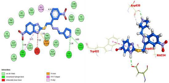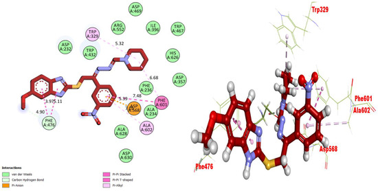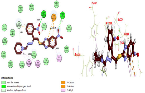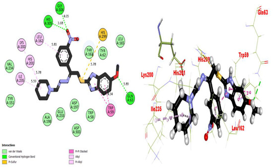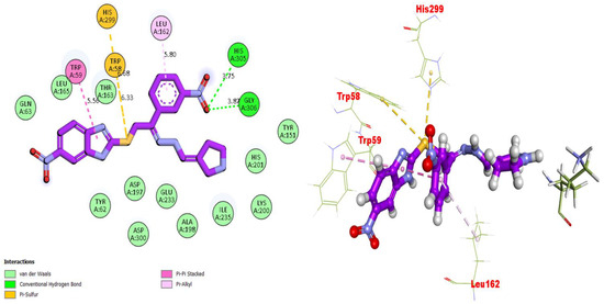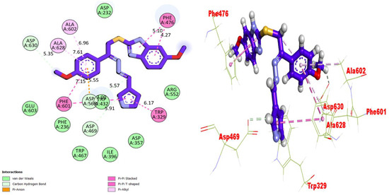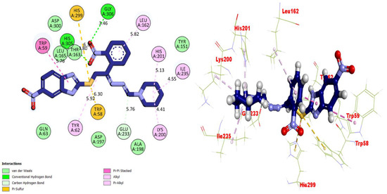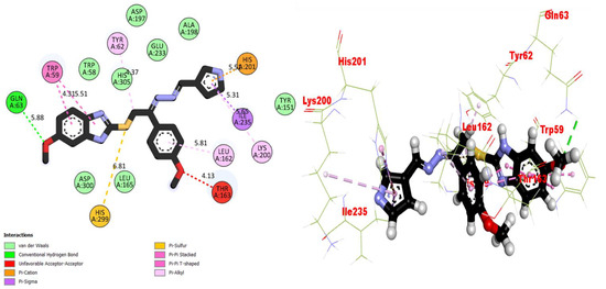 Molecular docking studies were performed for the compounds (bioactive moieties) in the synthesized series. Different software packages were used in order to sketch out the molecules in the protein complexes, namely, the auto dock tool, Pymol (2.5.2) and the Discovery studio visualizer (DSV). Our research groups have already worked on a similar package while using varied heterocyclic moieties [33,34,35]. Ligands were docked in the same places on the amino acids, where co-crystallized ligands were present in order to check the binding interactions of the synthesized moieties. For the purpose of docking, proteins were downloaded from the RCSB protein data bank (PDB) using the code 1ACL for AChE and 1P0P for BuChE, and both the proteins and ligand molecules were prepared in the DSV and the files were transferred to the auto dock tool, where polar hydrogens and charges were added, and the configuration files were saved in PDBQT format. Upon completion of these steps, the docking procedures were run and all the poses were visualized. After the successful completion of the procedures, nine different poses were obtained for each molecule along with binding affinities. Among these, the poses with very negative values (binding affinity) were selected. All the biologically potent molecules were docked into the binding pocket of the corresponding protein (Figure 3, Figure 4, Figure 5, Figure 6, Figure 7, Figure 8, Figure 9 and Figure 10). Docking scores and binding distances were also calculated (Table 2). Two- and three-dimensional binding visualizations are shown in the figures below.