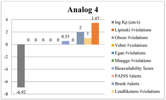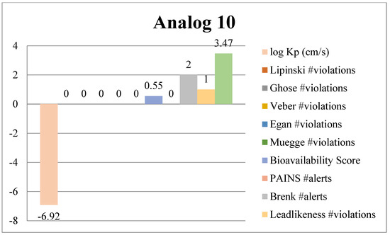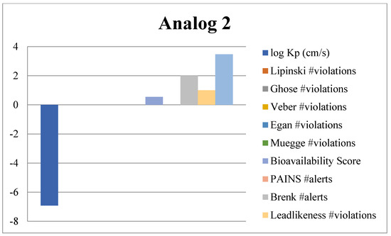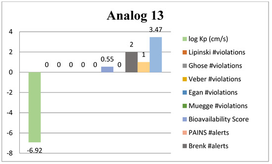 Absorption, Distribution, Metabolism and Excretion (ADME) analysis was conducted to evaluate the drug likeness properties of the synthesized potent benzimidazole-bearing pyrrole and piperidine hybrid derivatives using an online tool, Swiss ADME (Web online server). Significant outcomes of the ADME analysis further enhanced the molecular docking and biological activity studies. The ADME analysis also showed that marketed drugs violate drug likeness, whereas the potent compounds of the current novel series were reported with violations. These rules include PAINS, log Kp, lead likeness, Brenk alert, Veber, Ghose, Lipinski, Egan, bioavailability score and Muegge violations. The active compounds 2, 4, 10 and 13 of the novel series exhibited excellent inhibitory potency and showed remarkable drug likeness properties, which are illustrated in Figure 11, Figure 12, Figure 13 and Figure 14.