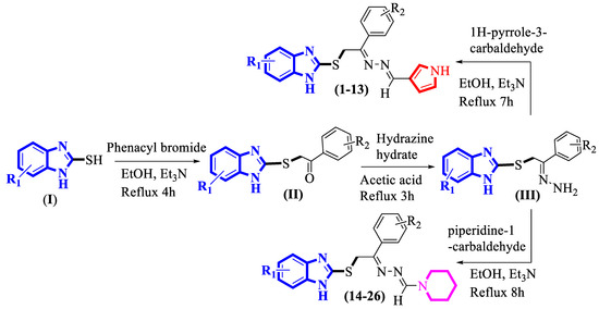 The synthesis of targeted benzimidazole-based pyrrole/piperidine derivatives (1–26) was achieved in a series of steps. Initially, 2-marcaptobenzimidazole (I) was reacted with differently substituted phenacyl bromides in ethanol and triethylamine, and then a reaction mixture was refluxed for 4 h to give S-substituted benzimidazole (II), which was further redissolved in a hydrazine hydrate solution while being stirred in acetic acid. After being refluxed for 3 h, the solvent was evaporated, and the resulting solid residue (III) was reacted in two different ways: