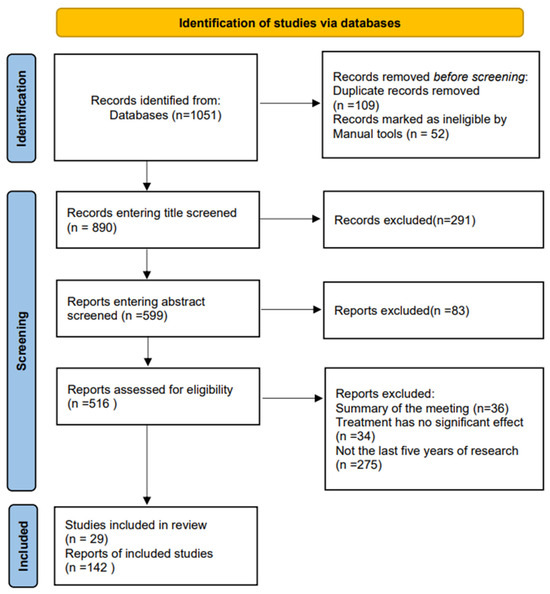 Literature screening flow chart. Initially, a total of 1051 relevant studies were retrieved from the database, 109 duplicates and 52 irrelevant articles were excluded, and 890 articles were accepted, including those on the biological properties of IL-7 and its relevance to cancer. The titles were reviewed, 291 articles were excluded, 83 articles were then excluded from the data based on the abstracts, and finally, 345 articles were excluded based on content, therapeutic efficacy, and year of publication. This process resulted in a total of 29 eligible reviews and 142 studies with their data screened.