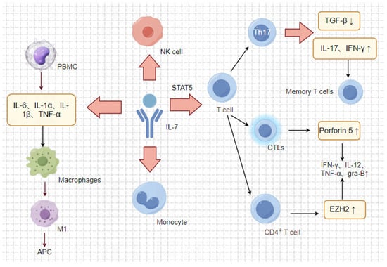 IL-7 enhances the cytotoxicity of cytotoxic T lymphocytes (CTLs), as well as monocytes, NKT, NK, and LAK cells. Additionally, IL-7 induces a degree of lymphokine-activated killer (LAK) activity. It also promotes the secretion of perforin 5 from CTLs in a STAT5-dependent manner and stimulates the expressions of IFN-γ [58], IL-12, and MIG [58]. Furthermore, in the presence of lymphopenia, IL-7 not only leads to the IL-7-dependent activation of STAT1 and STAT5 but also enhances the T cell response to IFN by regulating STAT1 protein expression levels [73]. In response to IL-7 stimulation, human peripheral blood mononuclear cells release a variety of cytokines, such as IL-6, IL-1α, IL-1β, and TNF-α. Additionally, in the presence of IFN-γ and TNF-α, it promotes macrophage polarisation toward the M1 phenotype and creates a pro-inflammatory environment [74]. Finally, it can also confer stat5-dependent multifunctionality on CD4+ T cells, resulting in an increased expression of the histone methyltransferase EZH2, which in turn promotes the expressions of IFN-γ, IL-2, TNF-α, and granzyme B.