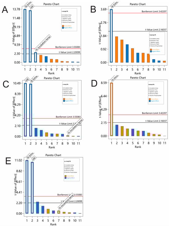 Pareto charts (sorted by order of importance) of the studied parameters for the peak area of (A) nPrBr, (B) isoPrBr, (C) nBuBr, (D) isoBuBr and (E) secBuBr.