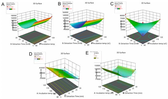 3D response surface plots showing the effects of the incubation temperature and extraction time on the peak area of (A) nPrBr, (B) isoPrBr, (C) nBuBr, (D) isoBuBr and (E) secBuBr.