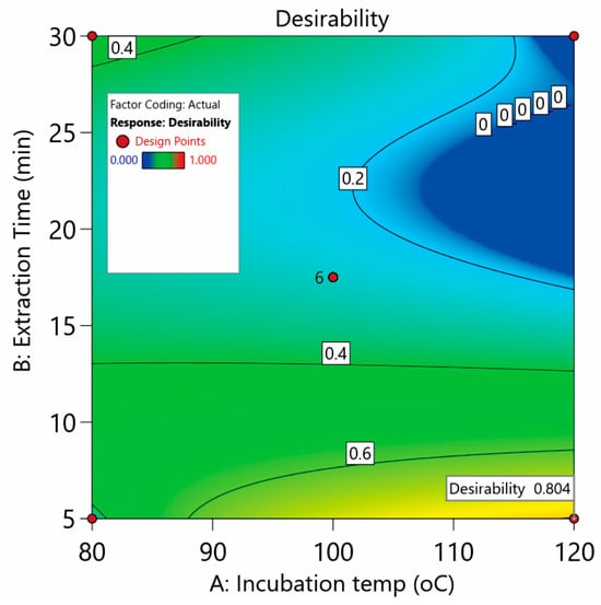 Undoubtedly, an improved overall extraction of the studied compounds is the main advantage of our method. On this basis, Derringer’s desirability function was utilized as the geometrical mean of the five individual desirability values di (weight factor = 1) for each response. The numerical optimization led to a global desirability of 0.804 (Figure 3). The optimum values were found to be 120 °C and 5 min for the incubation temperature and extraction time, respectively.