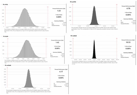 The robustness of the HS method was investigated using Monte-Carlo simulations and capability analysis. For this purpose, 100 k iterations were performed using Monte-Carlo simulation experiments, and the simulated data were utilized to estimate the Cpk values. The acceptance criteria of the peak area of analytes were established to ± 5% of the predicted value obtained from the optimization step. First, a group of simulation experiments was performed considering the mean value of 120 °C (temperature) and 5 min (extraction time), with standard deviation (SD) values of 1 and 0.5, respectively. The analysis revealed that the CpK values for all analytes were >1.33, except for nPrBr, showing that 5.22% of the results will be out of specification, suggesting minimization of the SD values. The readjustment of the SD value of the most robustness-sensitive parameter (extraction time) resulted in satisfactory CpK values of 1.49, 4.77, 1.43, 10.26 and 4.21 at SD values of 2 and 0.2 for the incubation time and extraction, respectively. Figure 4 illustrates the histogram from the capability analysis of the examined responses.