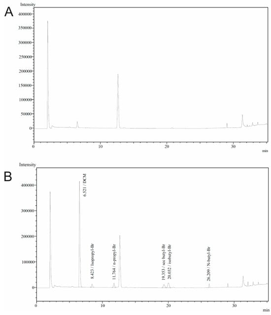 The development of a GC-ECD method for the separation and analysis of certain PGIs is vital for a fast and reliable turnaround of analytical results. Since the API samples may contain other OVIs, i.e., methanol (MeOH), ethanol (EtOH), acetonitrile (ACN), benzene (BNZ), tetrahydrofuran (THF), ethyl acetate (EtOAc), dichloromethane (DCM), dimethylformamide (DMF) and acetic acid (AcA), a mixture of these solvents with the analytes was utilized for the study and optimization of the separation conditions. As expected, only DCM was detected using ECD, which was successfully separated from isoPrBr at low oven temperatures (i.e., 45 °C) using the DB-624 as a stationary phase. However, no baseline separation between secBuBr and isoBuBr was obtained at these conditions. Taking into account that both compounds have almost identical boiling points (ca 91 °C), experimental trials were conducted using lower oven temperatures. Finally, an oven temperature of 35 °C was chosen for the first 25 min of the analysis, resulting in a resolution of 1.6 between the respective impurities. After that period, a ramp of 25 °C/min followed by a hold time of 2 min at 240 °C was implemented for column cleanup, avoiding potential carry-over effects. Higher ramp values were not tested to prevent obtaining a noisy and upward slope baseline.