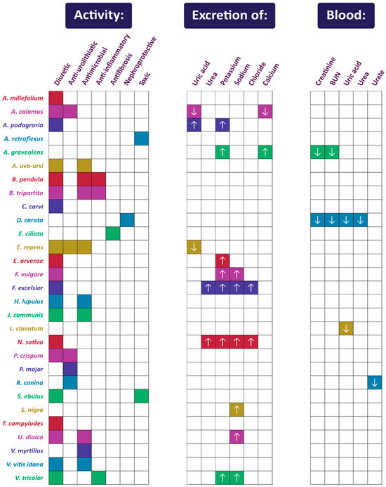 Summary of activities of plants used in Polish folk medicine to treat urinary disorders (confirmed by scientific studies). The arrows indicate an increase (upward-facing arrow) or decrease (downward-facing arrow) in the excretion or blood concentration of compounds and markers. Compilation of data from Section 2.