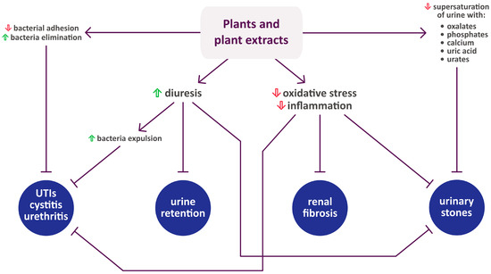 Figure 1 summarizes the activity of each plant listed in Section 2, while Figure 2 shows their mechanisms of action in urinary diseases and disorders.