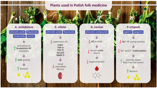 Main chemical compounds of selected plants used in Polish folk medicine to treat urinary diseases and their potential molecular targets of action. Upward-facing green arrows indicate an increase, while downward-facing red arrows indicate a decrease. COX, cyclooxygenase; KIM1, kidney injury molecule 1; TNF-α, tumor necrosis factor alpha; TGF-β, transforming growth factor β; MMP 9, matrix metalloproteinase 9; XO, xanthine oxidase.