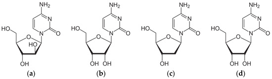 The isolation of a number of unique nucleosides including spongothymidine (3-β-D-arabofuranosylthymine) and spongouridine (3-β-D-arabofuranosyluracil) from the Caribbean sponge Cryptotethya crypta (now Tectitethya crypta) by Bergmann et al. [1], and the observation that these compounds can act as terminators of the DNA synthesis chain, initiated research on the new and separate class of nucleotides with modified glycone part: arabinosides. The possibility that they have a role as anti-viral, anti-cancer as well as anti-cellular senescence drug has sparked interest in them. In 1959, Walwick, Roberts and Dekkerin [2] synthesized Cytarabine, (Cytosine arabinoside; Cytosine-1-β-D-arabinofuranoside; Ara-C), a synthetic isomer of cytidine, that differs from cytidine and deoxycytidine, only in the sugar (D-arabinose instead of ribose and deoxyribose, respectively), Figure 2.