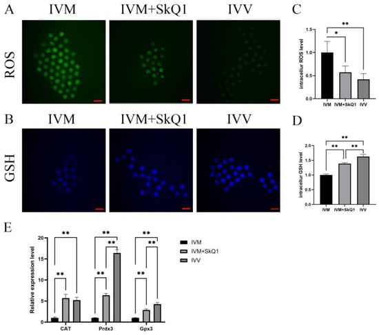 To investigate the impacts of SkQ1 on alleviating oxidative stress in mouse oocytes during IVM, we assessed ROS and GSH levels, along with the mRNA expression levels of antioxidant genes GPx3, CAT, and Prdx3 in the IVM, IVM + SkQ1, and IVV groups of oocytes. The ROS level in the IVM + SkQ1 group of oocytes, which was similar to that in the IVV oocyte group, was significantly lower (p < 0.05) than that in the IVM group of oocytes (Figure 2A,C); The GSH level in the IVM + SkQ1 oocytes was significantly higher than that in the IVM oocytes, and was comparable to that in the IVV oocytes (Figure 2B,D). The transcription levels of three antioxidant genes, GPx3, CAT, and Prdx3,in the IVM + SkQ1 and IVV groups were significantly higher than those in the IVM oocytes (Figure 2E). These data imply that SkQ1 treatment during IVM significantly reduces oxidative stress levels and increases antioxidant capacity in mouse oocytes.